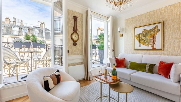 With a breathtaking Eiffel Tower view, a lovely private balcony, elegant historic details and exquisite designer interiors, the stunning Richebourg captures the very best of refined Parisian living.